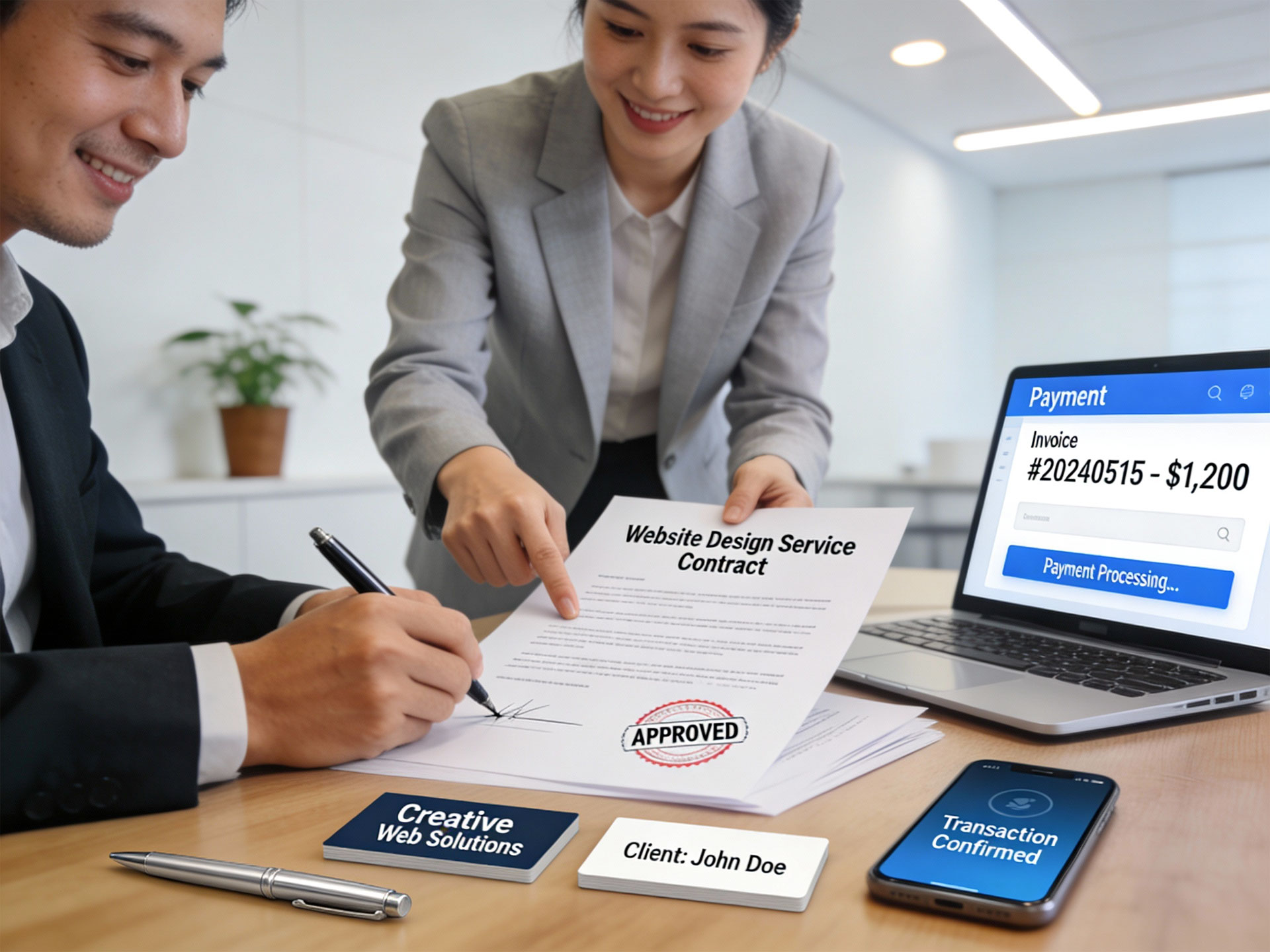 홈페이지 개발과 홍보상품에 대한 계약서를 작성하고 결제를 진행합니다. 결제금액은 부가세 별도이며 착수금 30% 중도금 30% 잔금 40%로 진행됩니다.