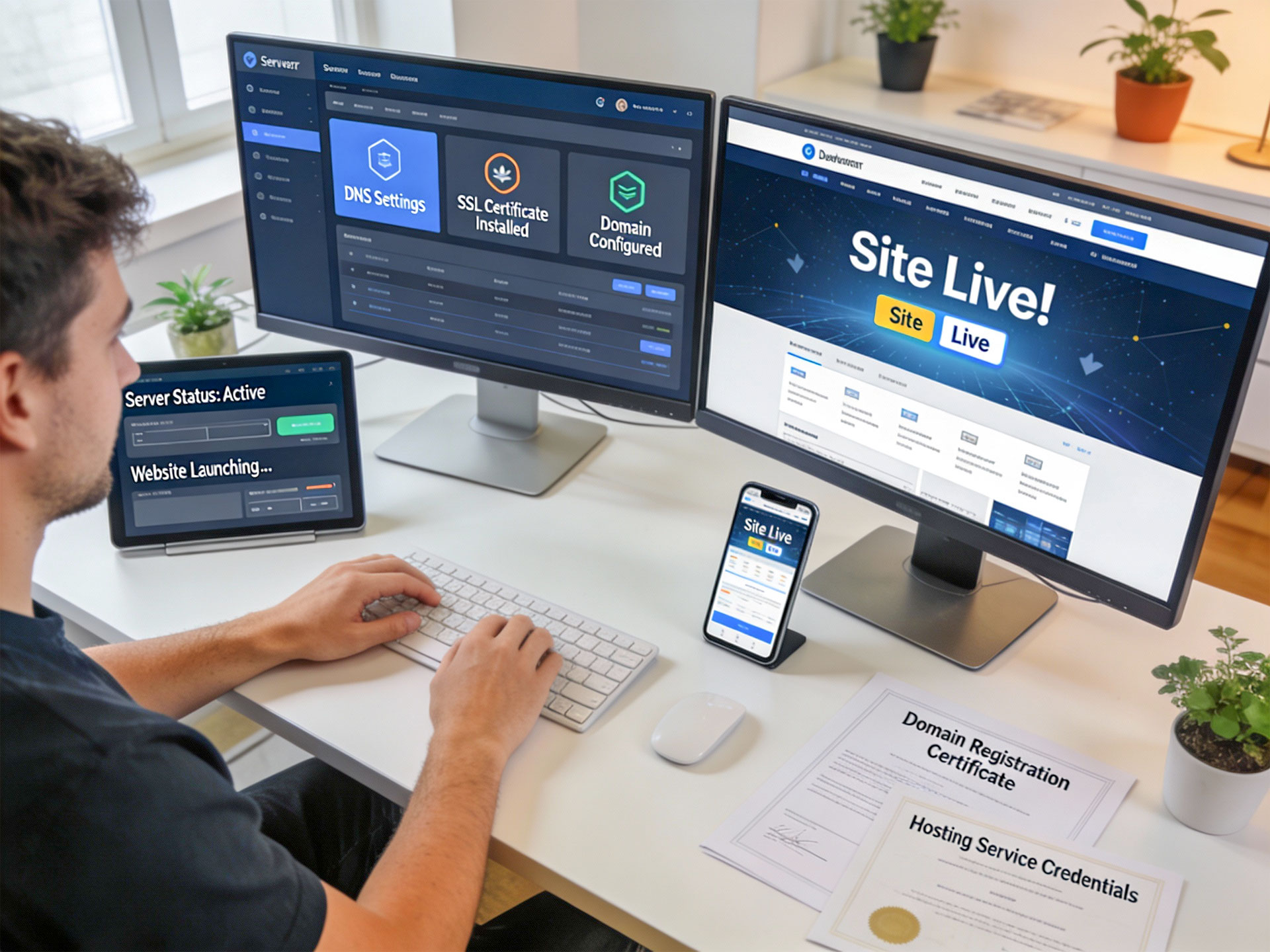 웹호스팅 설정, 도메인 연결, SSL 보안인증서, 데이터베이스 세팅하고 웹 소스를 웹서버에 전송하고 홈페이지를 오픈합니다.